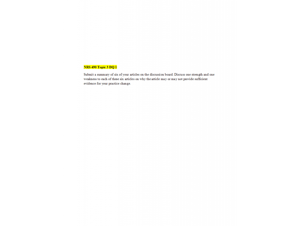 Submit a summary of six of your articles on the discussion board. Discuss one strength and one weakness to each of these six articles on why the article may or may not provide sufficient evidence for your practice change.