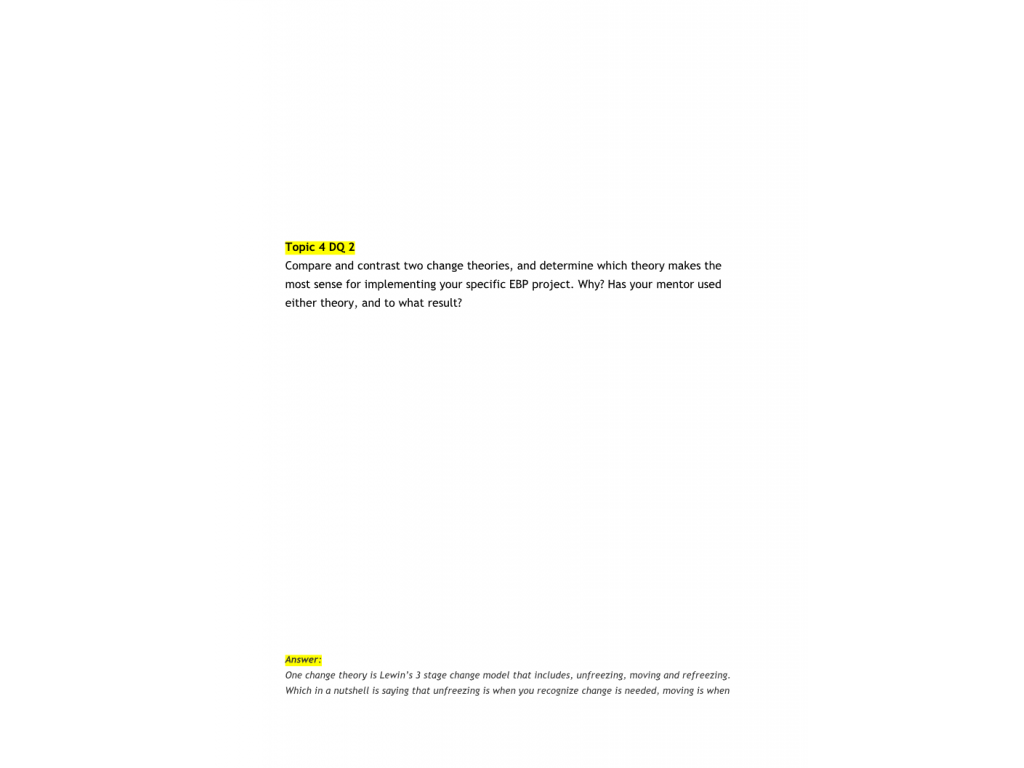 Compare and contrast two change theories, and determine which theory makes the most sense for implementing your specific EBP project. Why? Has your mentor used either theory, and to what result?