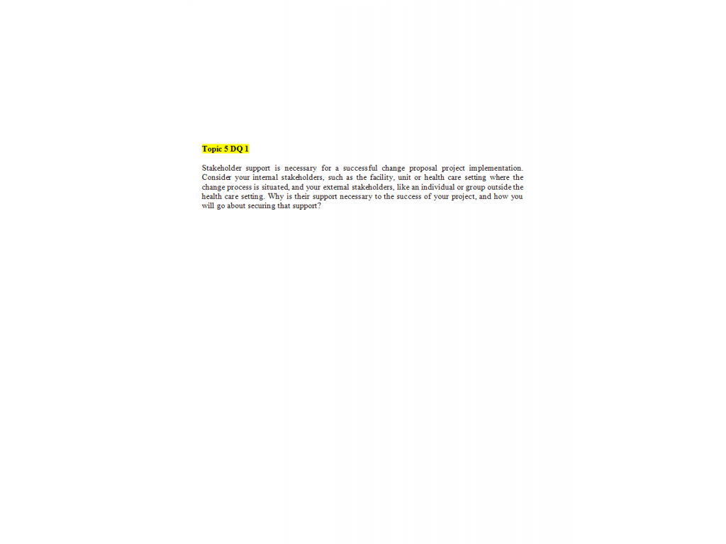 Stakeholder support is necessary for a successful change proposal project implementation. Consider your internal stakeholders, such as the facility, unit or health care setting where the change process is situated, and your external stakeholders, like an individual or group outside the health care setting. Why is their support necessary to the success of your project, and how you will go about securing that support?