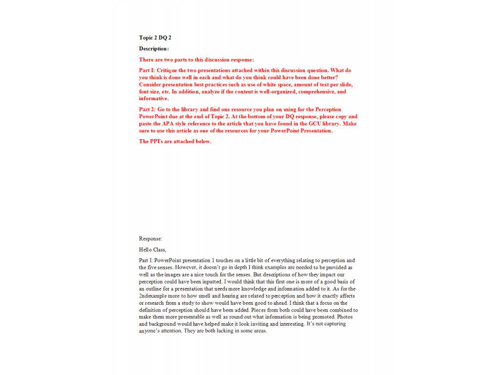 Part I: Critique the two presentations attached within this discussion question. What do you think is done well in each and what do you think could have been done better? Consider presentation best practices such as use of white space, amount of text per slide, font size, etc. In addition, analyze if the content is well-organized, comprehensive, and informative.